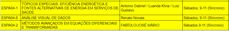 Serão oferecidas vagas para matrícula especial de discentes, exclusivamente nas disciplinas de acordo com o Calendário Especial/AENPE, em consonância com a Resolução 19/2020/CONSUP/IFBA, com Período Letivo Previsto de 16/10/2020 a 19/12/2020: