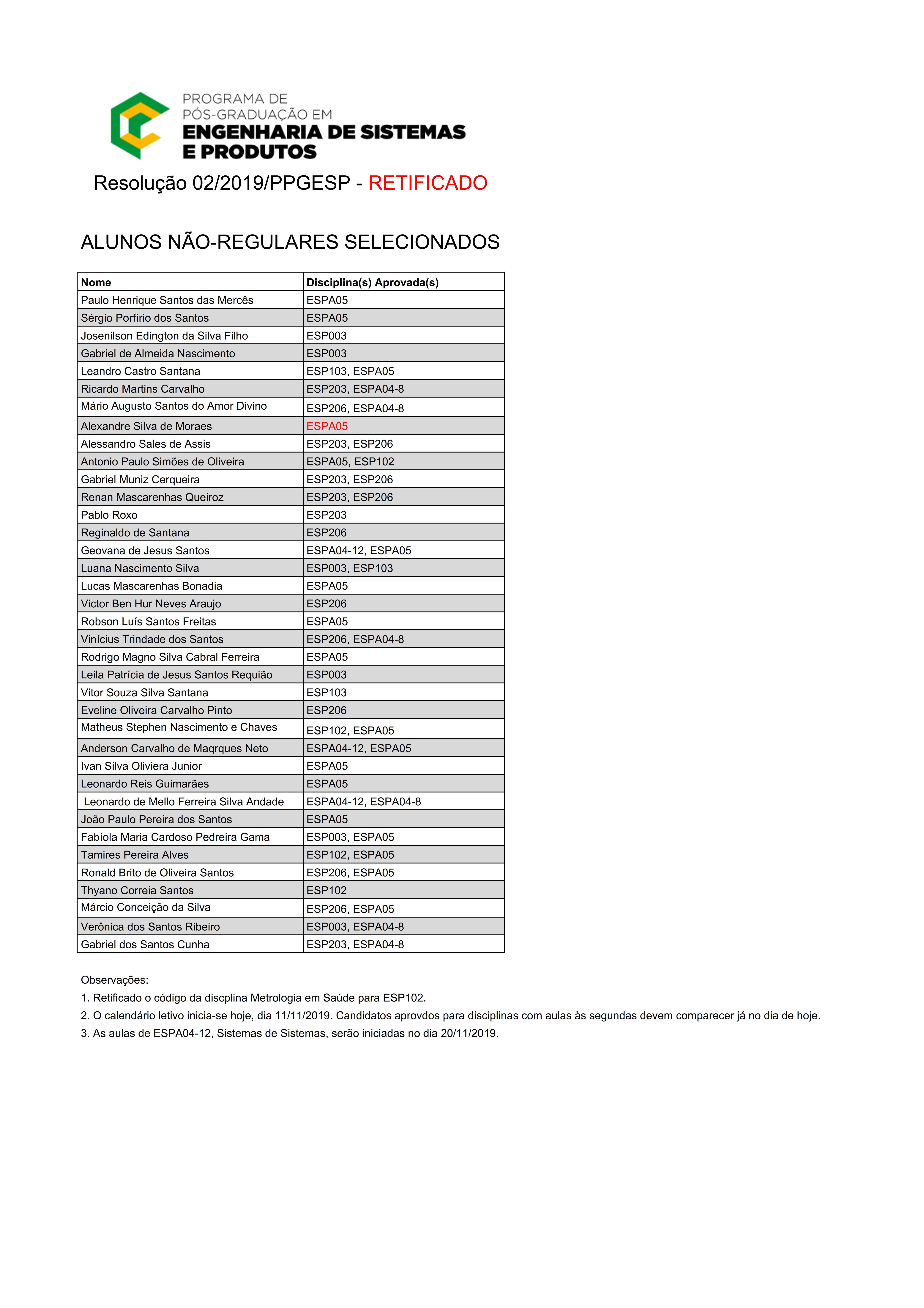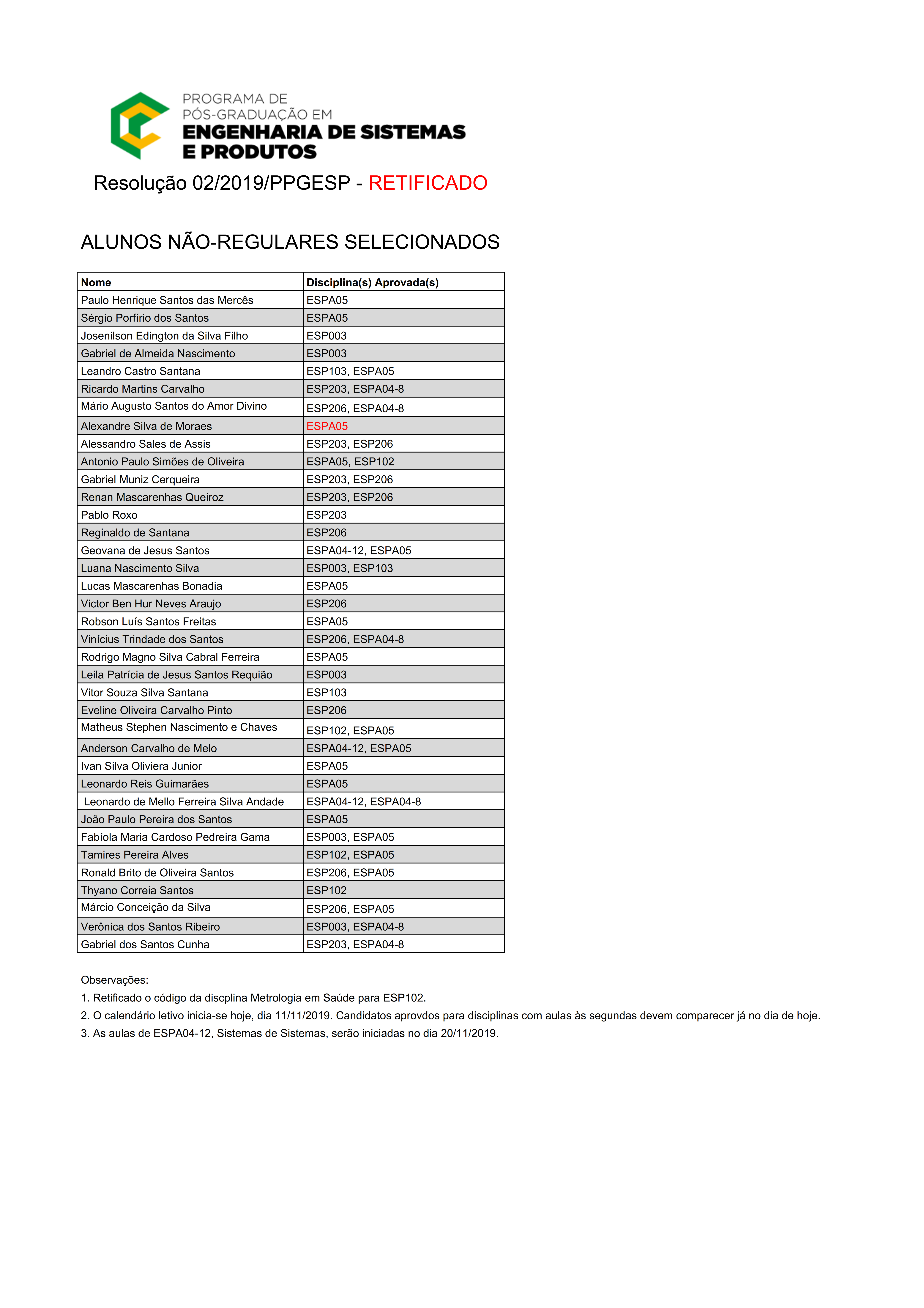 Resultado Retificado da Chamada Pública 03-2017 para Aluno Não-Regular (Aluno Especial) do PPGESP